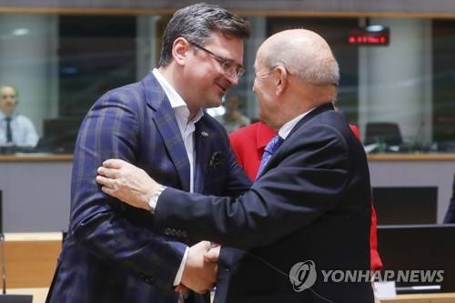 Ukraine's foreign minister Dmytro Kuleba, left, is welcomed by foreign minister of France Jean-Yves Le Drian at a meeting of EU foreign ministers at the European Council building in Brussels, Monday, May 16, 2022. European Union foreign ministers on Monday will discuss current affairs and have an exchange of views on the Russian aggression against Ukraine and the Global Gateway. (Stephanie Lecocq/Pool Photo via AP)