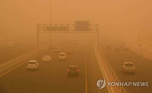 epa09950998 Vehicles transit at a road shrouded in heavy dust in Kuwait City, Kuwait, on 16 May 2022. EPA/Noufal Ibrahim