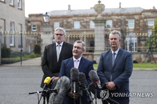 Democratic Unionist Party leader Jeffrey Donaldson, centre, and party colleagues Gavin Robinson left, and Edwin Poots talk to the media at Hillsborough Castle, Northern Ireland, Monday, May, 16, 2022. British Prime Minister Johnson said there would be “a necessity to act” if the EU doesn't agree to overhaul post-Brexit trade rules that he says are destabilizing Northern Ireland's delicate political balance. Johnson was holding private talks with the leaders of Northern Ireland's main political parties, urging them to get back to work. (AP Photo/Peter Morrison)