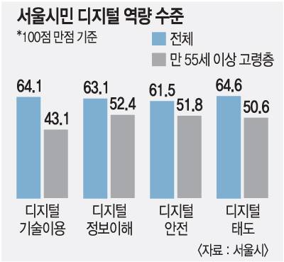 서울시가 지방자치단체 중 최초로 시민들의 디지털 역량을 심층 조사했다. 만 55세 이상 노령층은 다른 연령층보다 상대적으로 디지털 역량 수준이 떨어지는 것으로 조사됐다.