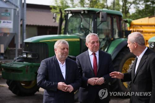epa09951159 Polish Agriculture Minister Henryk Kowalczyk (C) and US Agriculture Secretary Tom Vilsack (R) during a visit with Ukrainian Agriculture Minister Mykola Solskyi (not pictured) to the farm of a Polish farmer Wiktor Szmulewicz (L) in Stare Swiecice, east-central Poland, 16 May 2022. EPA/Leszek Szymanski POLAND OUT