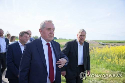 epa09951167 Polish Agriculture Minister Henryk Kowalczyk (C) and US Agriculture Secretary Tom Vilsack (R) during a visit with Ukrainian Agriculture Minister Mykola Solskyi (not pictured) to the farm of a Polish farmer Wiktor Szmulewicz in Stare Swiecice, east-central Poland, 16 May 2022. EPA/Leszek Szymanski POLAND OUT