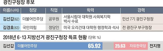역대 지방선거 결과를 살펴봐도 광진구는 국민의힘과 민주당 측의 손을 번갈아 들어 줬다. 민선 1기 민주당에 이어 민선 2~4기 12년간 한나라당(현 국민의힘), 민선 5~7기 12년간 민주당이 집권했다. 민주당에서는 지역에서 구의원, 시의원, 민선 7기 구청장 등을 지내며 표밭을 다진 김선갑 후보가 재선에 도전한다. 이에 맞서 서울시 고위직 출신이자 오세훈 국민의힘 서울시장 후보와 가까운 김경호 국민의힘 후보가 ‘링’에 오른다.