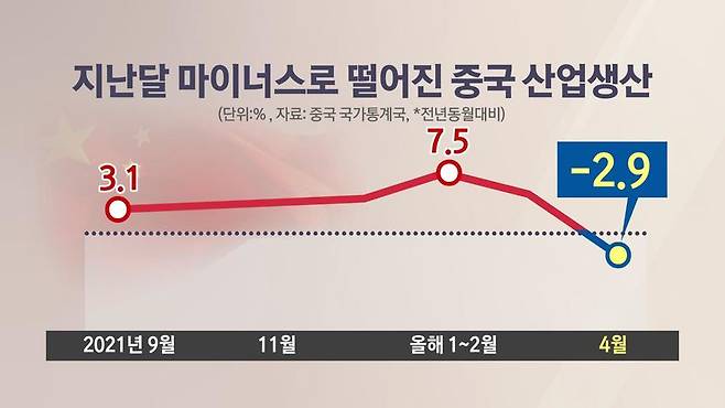 먼저 지난달 중국 산업생산이 1년 전보다 2.9% 감소했습니다.