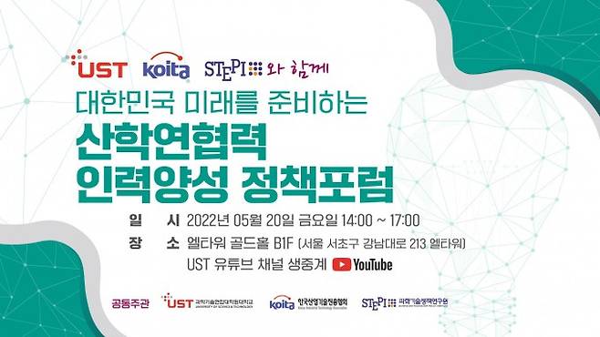 ■ 과학기술연합대학원대학교(UST)와 한국산업기술진흥협회, 과학기술정책연구원(STEPI)이 공동 주관하는 '산학연 협력 인력양성 정책포럼'이 20일 14시부터 17시까지 서울 양재 엘타워 골드홀에서 열린다.