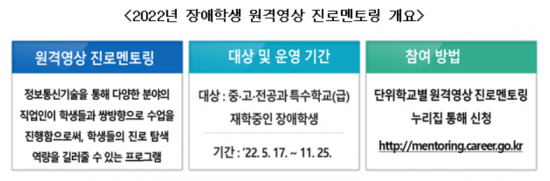 교육부는 장애학생에게 다양한 진로탐색 기회를 제공하기 위해 17일부터 장애인 진로멘토단을 통한 '2022년 원격 영상 진로멘토링' 수업을 시작한다고 밝혔다.