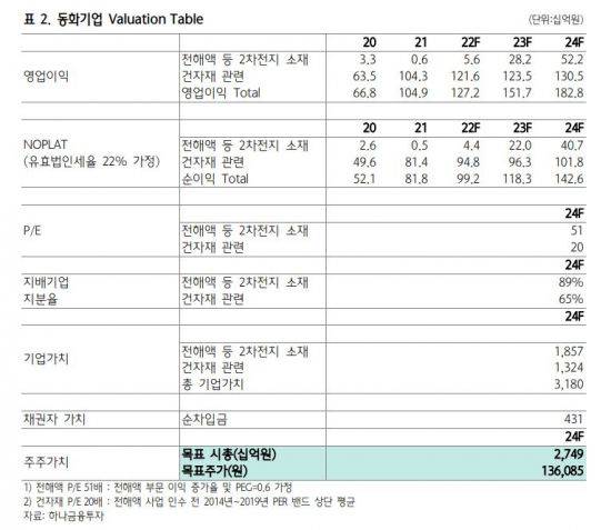 목표주가는 동화기업의 기업가치를 3조2000억원으로 추산하고, 순차입금 4000억원을 반영한 목표 시가총액을 2조8000억원으로 계산해 산출했다.
