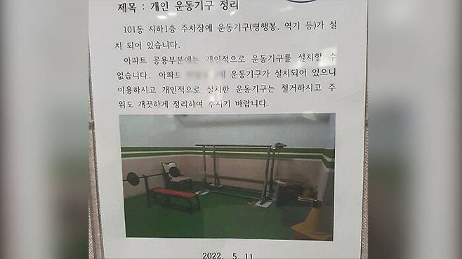지하주차장에 평행봉, 역기 같은 운동기구들이 설치된 사진과 함께 '아파트 공용 부문에는 개인적으로 운동기구를 설치할 수 없으니 철거해달라'는 내용이 적혀 있습니다.