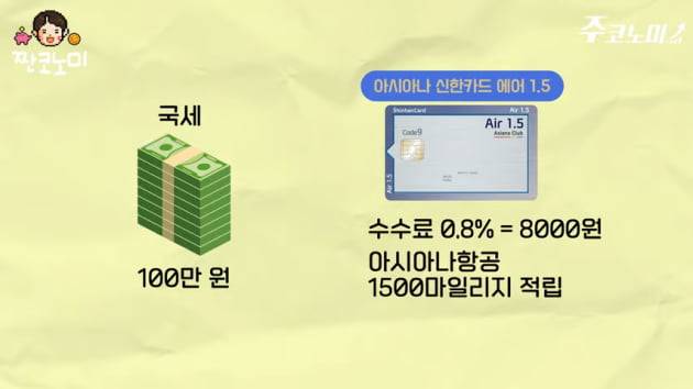국세를 납부할 때도 마일리지를 적립해주는 신용카드도 아직 있습니다. '아시아나 신한카드 에어 1.5'의 경우 연회비 4만3000원에 1000원당 1.5 아시아나 마일리지를 적립해줍니다. 예를 들어 100만원을 국세로 낸다고 가정하면 카드 납부 수수료 8000원이 발생하지만 대신 1500 마일을 쌓을 수 있습니다.