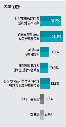 지역 현안을 묻는 질문에서는 ‘강원도 맞춤 도로, 철도인프라 구축’(28.3%)과 ‘강원경제특별자치도 설치 및 규제 개혁’(26.7%)이 압도적으로 많았다. 이어 ‘산간 및 의료시설 부족 지역에 병원 등 의료 인프라 구축’(12.5%), ‘폐광지역 경제활성화’(11.9%), ‘테마파크 유치 및 글로벌 관광사업 육성’(10.8%), ‘기타 다른 현안’(5.2%), ‘잘모름’(4.6%) 등의 순이었다.