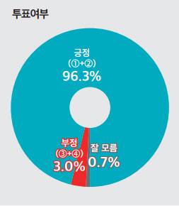 투표 의사를 묻는 질문에는 ‘반드시 투표하겠다’가 89.3%로, 유권자 10명 중 9명은 투표 의사를 적극적으로 밝혔다. 이어 ‘가급적 투표’ 7.0%, ‘별로 투표할 생각 없음’ 2.2%, ‘전혀 투표할 생각 없음’ 0.8%, ‘잘모름’ 0.7% 등의 순이었다.
