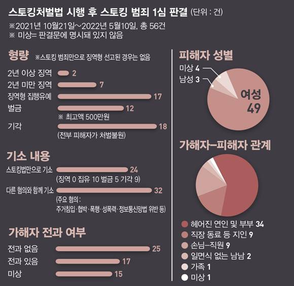 그렇다면 이들의 기대와 바람대로 처벌은 '확실하게' 이뤄져왔을까. 시사저널은 법 시행 첫날(2021년 10월21일)부터 5월10일까지 약 7개월간 스토킹처벌법 위반 혐의로 기소됐거나 재판부가 가해자의 범죄를 스토킹 행위로 규정한 사건의 1심 판결문 56건을 전수 분석했다. 그 결과 10만원 이하 벌금형 또는 기각 일색이던 이전과 달리, 처벌 강도가 전반적으로 상향된 모습을 보였다. 재판부가 판결 중 스토킹 범죄를 '심각한 사회문제로 대두되고 있는 범죄'라고 명시하는 등 문제의식을 강조하는 경우도 더러 있었다.