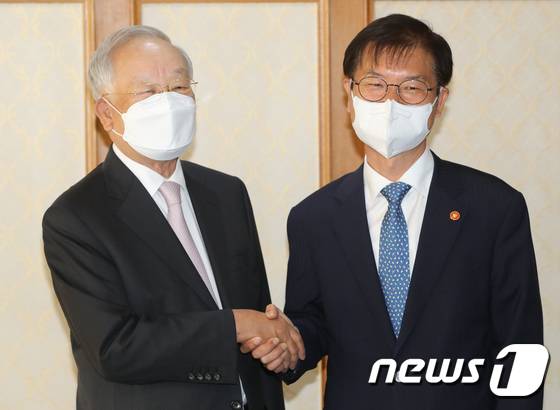 (서울=뉴스1) 허경 기자 = 이정식 고용노동부 장관(오른쪽)이 17일 서울 마포구 한국경영자총협회를 방문해 손경식 회장과 인사를 나누고 있다. 2022.5.17/뉴스1
