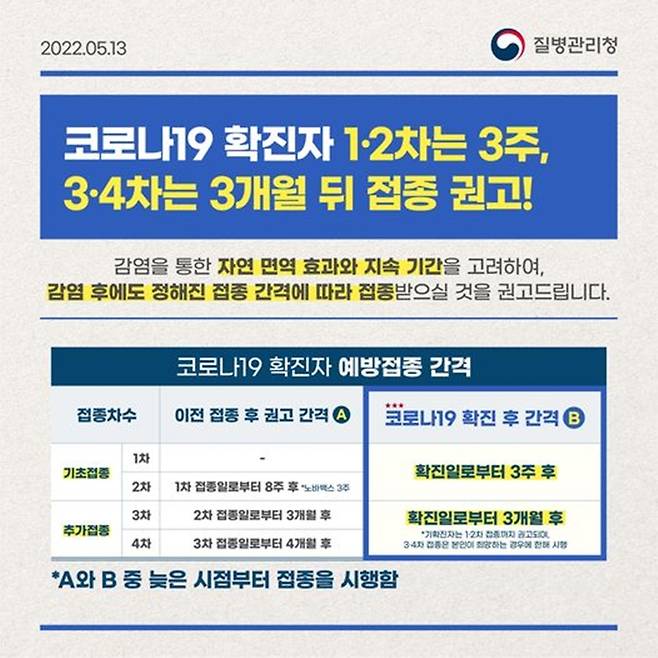 - A(이전 접종 후 권고 간격)와 B(확진 후 간격) 중 늦은 시점부터 접종 시행