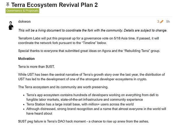 권도형 대표는 17일 테라 블록체인 커뮤니티 아고라를 통해 '테라 생태계 재생 계획 2'를 게시하며 테라 블록체인 하드포크를 통해 새로운 블록체인과 새로운 코인을 발행하겠다고 제안했다. 앞서 전날 첫 번째 테라 생태계 부활 계획을 올린 뒤 하루 만에 두 번째 제안을 거버넌스 투표에 올린 것이다. 권 대표는 아시아 기준으로 오는 18일에 해당 제안을 거버넌스 투표(코인 홀더 투표)에 올리겠다고 밝혔다.
