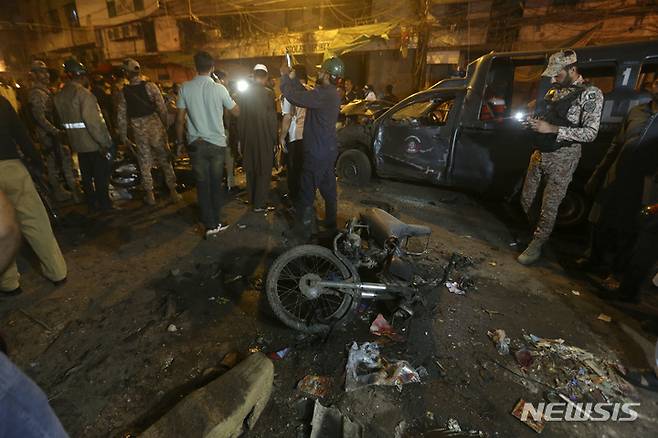 [카라치=AP/뉴시스] 16일(현지시간) 파키스탄 카라치에서 경찰이 폭탄 폭발 현장을 조사하고 있다. 경찰은 카라치 인근 시장 경찰 차량 근처에 있던 오토바이에 장착된 사제폭탄이 터져 행인 1명이 숨지고 경찰관 포함 11명이 다쳤다고 밝혔다. 2022.05.17.