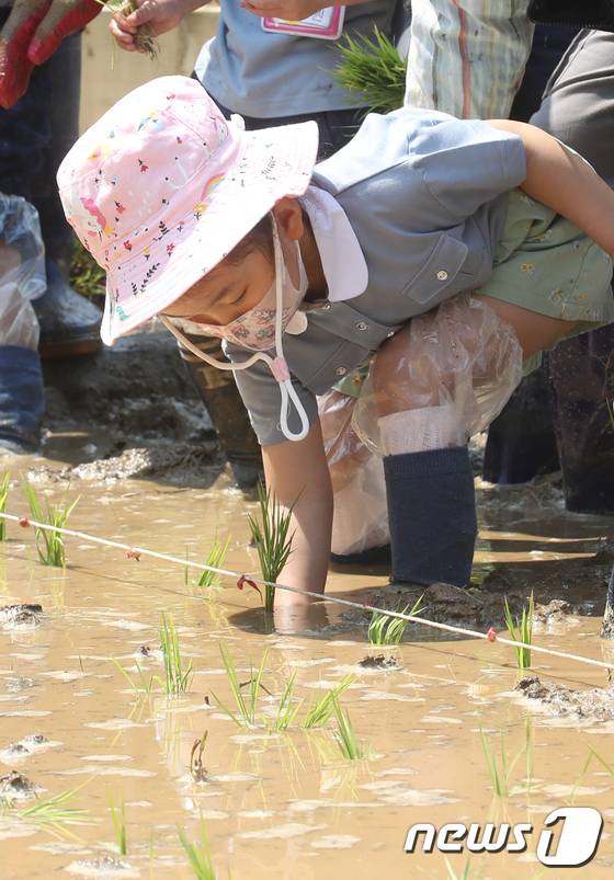 (서울=뉴스1) 송원영 기자 = 17일 서울 양천구 신트리공원에서 열린 '도심 속 모내기 체험' 행사에서 어린이들이 모내기를 하고 있다. 2022.5.17/뉴스1