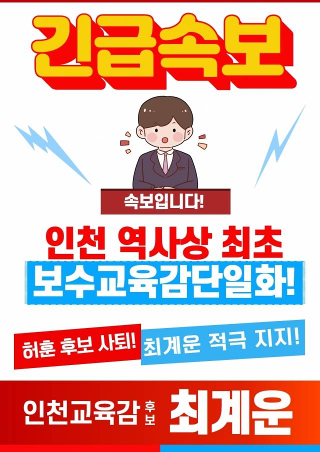 그는 또 “문제점 많은 현 인천교육을 바꿔야 한다는 허 후보에 100% 공감하고, 아무 조건 없이 보수 단일화만을 위해 양보해준 허훈 후보의 뜻을 잘 받들겠다”고 했다.