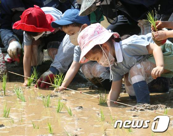 (서울=뉴스1) 송원영 기자 = 17일 서울 양천구 신트리공원에서 열린 '도심 속 모내기 체험' 행사에서 어린이들이 모내기를 하고 있다. 2022.5.17/뉴스1