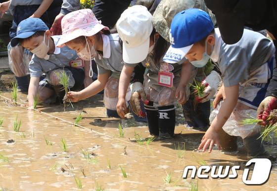 (서울=뉴스1) 송원영 기자 = 17일 서울 양천구 신트리공원에서 열린 '도심 속 모내기 체험' 행사에서 어린이들이 모내기를 하고 있다. 2022.5.17/뉴스1