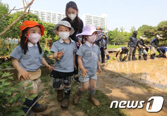 (서울=뉴스1) 송원영 기자 = 17일 서울 양천구 신트리공원에서 열린 '도심 속 모내기 체험' 행사에서 어린이들이 모내기를 마친 후 손을 씻기 위해 이동 하고 있다. 2022.5.17/뉴스1