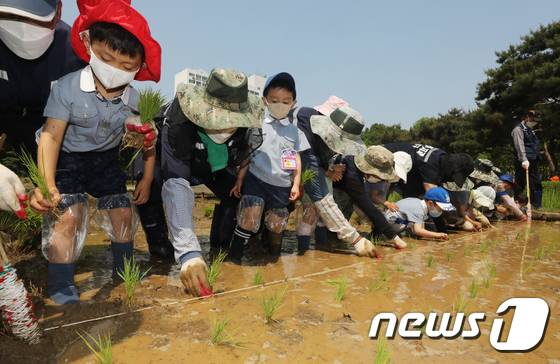 (서울=뉴스1) 송원영 기자 = 17일 서울 양천구 신트리공원에서 열린 '도심 속 모내기 체험' 행사에서 어린이들이 모내기를 하고 있다. 2022.5.17/뉴스1