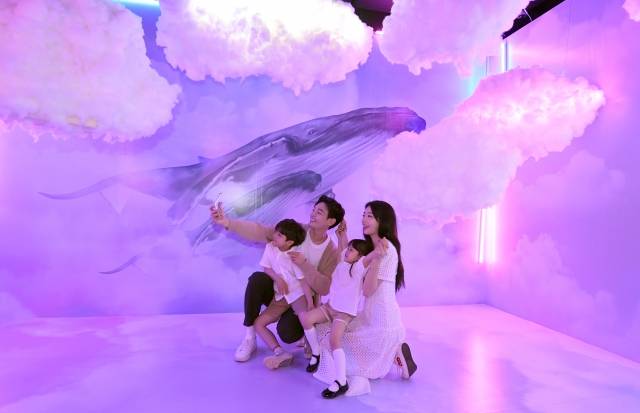 17일 서울 송파구 롯데월드타워 전망대 서울스카이를 찾은 가족들이 미디어아트 특별전 '나는 고래'를 관람하고 있다.