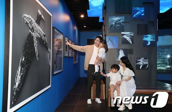 (서울=뉴스1) 구윤성 기자 = 17일 서울 송파구 롯데월드타워 서울스카이에서 모델들이 미디어아트 특별전 '나는 고래'를 소개하고 있다. '나는 고래'는 서울스카이가 오픈 5주년을 맞아 장남원 작가와 함께한 미디어아트 특별전시다. 지하 1층 입구부터 메인 갤러리까지 바다를 유영하는 고래의 모습을 포착한 30여점의 작품들을 미디어아트와 갤러리 형식으로 전시했다. (공동취재) 2022.5.17/뉴스1
