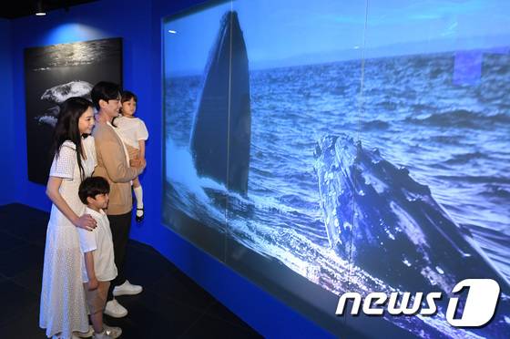 (서울=뉴스1) 구윤성 기자 = 17일 서울 송파구 롯데월드타워 서울스카이에서 모델들이 미디어아트 특별전 '나는 고래'를 소개하고 있다. '나는 고래'는 서울스카이가 오픈 5주년을 맞아 장남원 작가와 함께한 미디어아트 특별전시다. 지하 1층 입구부터 메인 갤러리까지 바다를 유영하는 고래의 모습을 포착한 30여점의 작품들을 미디어아트와 갤러리 형식으로 전시했다. (공동취재) 2022.5.17/뉴스1