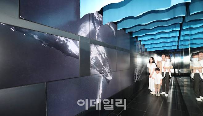 [이데일리 방인권 기자] 17일 서울 송파구 롯데월드타워 서울스카이를 찾은 시민들이 미디어아트 특별전 '나는 고래'의 미디어터널을 지나고 있다.