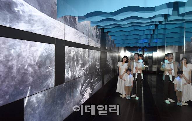 [이데일리 방인권 기자] 17일 서울 송파구 롯데월드타워 서울스카이를 찾은 시민들이 미디어아트 특별전 '나는 고래'의 미디어터널을 지나고 있다.