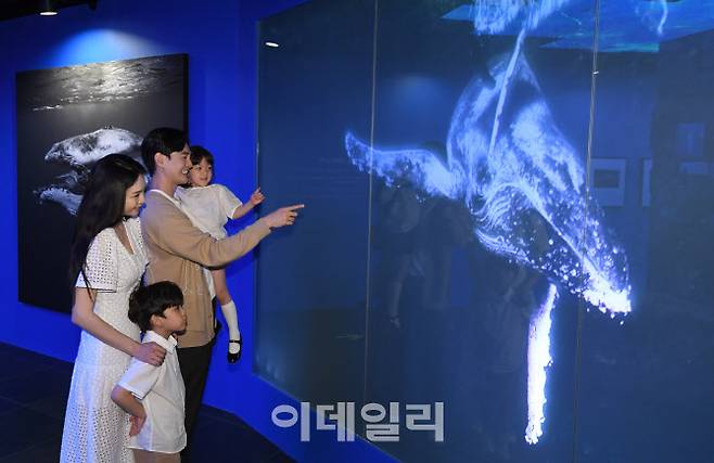 [이데일리 방인권 기자] 17일 서울 송파구 롯데월드타워 서울스카이를 찾은 시민들이 미디어아트 특별전 '나는 고래'를 관람하고 있다.