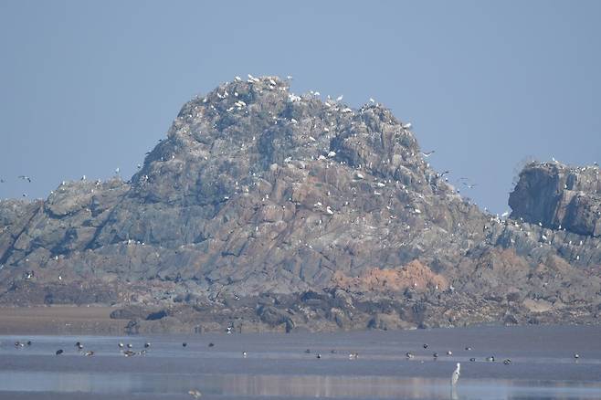이 저어새들은 서천군과 전남 영광군 다른 번식지에서 이주해온 것으로 추정됐다. 사진은 충남 서천군 유부도 인근에서 새로 확인된 저어새 집단번식지. 2022.5.17 [국립생태원 제공. 재판매 및 DB 금지]