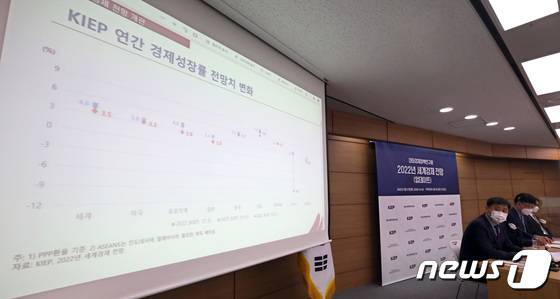 (세종=뉴스1) 김기남 기자 = 안성배 대외경제정책연구원 국제거시금융실장(왼쪽)이 17일 오전 정부세종청사에서 2022년 세계경제 전망을 발표하고 있다. 2022.05.17/뉴스1