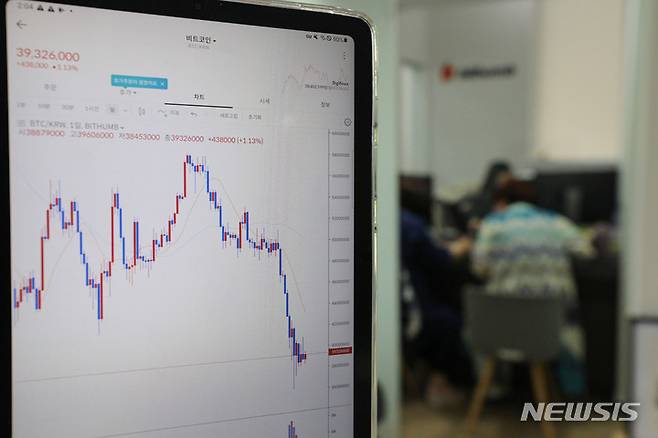 [서울=뉴시스] 권창회 기자 = 비트코인이 미국 금리인상과 루나사태가 겹치며 내림세를 보이고 있는 17일 오후 서울 서초구 빗썸 고객센터 태블릿에 암호화폐 시세가 표시되고 있다. 2022.05.17. kch0523@newsis.com