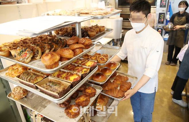 [이데일리 김태형 기자] 세계 밀 생산량 2위인 인도가 식량 안보를 이유로 밀 수출을 전격 금지한 가운데 17일 서울 양천구의 한 제과점에서 소상공인이 빵을 만들고 있다.