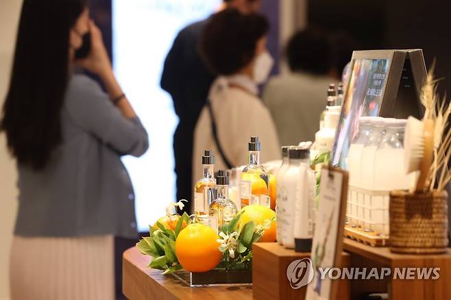 (서울=연합뉴스) 강민지 기자 = 러시아의 우크라이나 침공 사태와 인도네시아 팜유 수출 중단 사태 등으로 화장품과 비누 등 생활용품 가격이 상승 압박을 받고 있다. 주원료인 팜유와 곡물 등 원재료 가격이 급등하고 있기 때문이다. 17일 서울의 한 백화점 화장품 매장. 2022.5.17