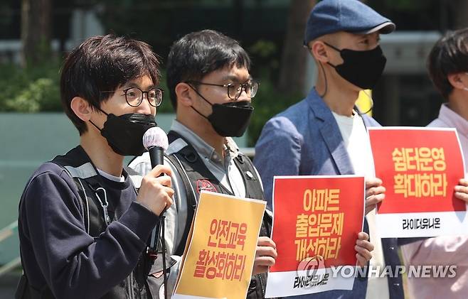 (서울=연합뉴스) 신현우 수습기자 = 박정훈 라이더유니온 위원장이 17일 오전 서울시청 앞에서 열린 6·1 지방선거 정책요구안 발표 기자회견에서 발언하고 있다.