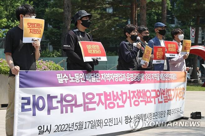 (서울=연합뉴스) 신현우 수습기자 = 박정훈 라이더유니온 위원장이 17일 오전 서울시청 앞에서 열린 6·1 지방선거 정책요구안 발표 기자회견에서 발언하고 있다.
