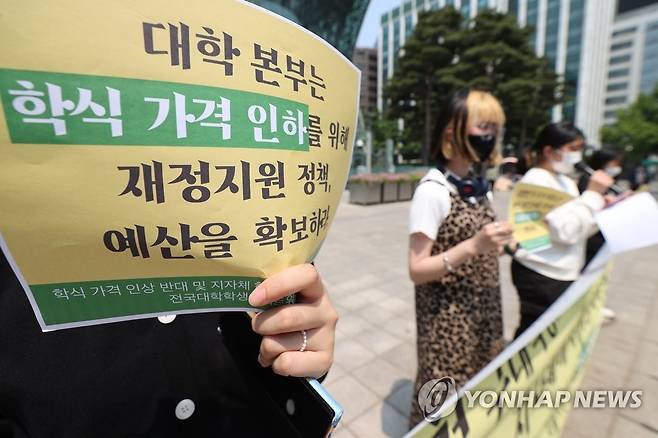 (서울=연합뉴스) 신현우 수습기자 = 전국대학학생네트워크(전대넷) 관계자들이 17일 오후 서울시청 앞에서 학식 가격 인상 반대 및 가격 안정화 예산 확대 촉구 기자회견을 하고 있다.