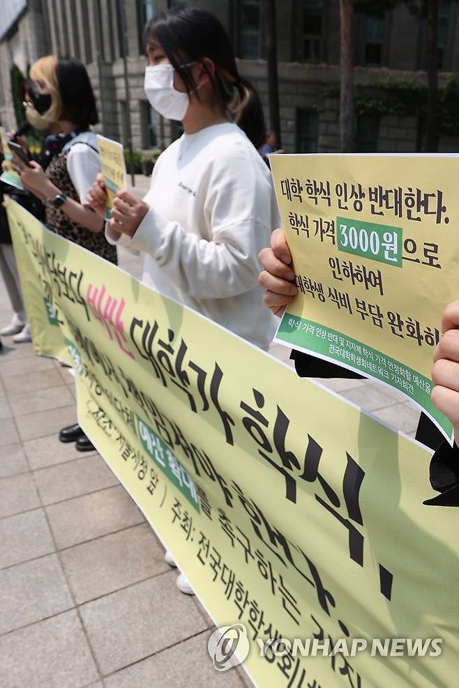 (서울=연합뉴스) 신현우 수습기자 = 전국대학학생네트워크(전대넷) 관계자들이 17일 오후 서울시청 앞에서 학식 가격 인상 반대 및 가격 안정화 예산 확대 촉구 기자회견을 하고 있다.