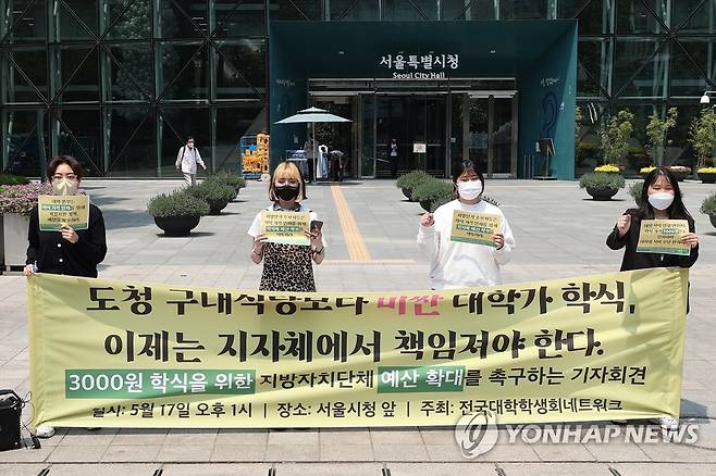 (서울=연합뉴스) 신현우 수습기자 = 전국대학학생네트워크(전대넷) 관계자들이 17일 오후 서울시청 앞에서 학식 가격 인상 반대 및 가격 안정화 예산 확대 촉구 기자회견을 하고 있다.