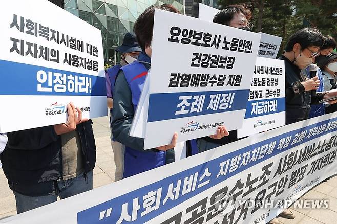 (서울=연합뉴스) 신현우 수습기자 = 민주노총 공공운수노조 관계자들이 17일 오전 서울시청 앞에서 기자회견을 열고 사회서비스 노동자 6·1 지방선거 요구안을 발표하고 있다.