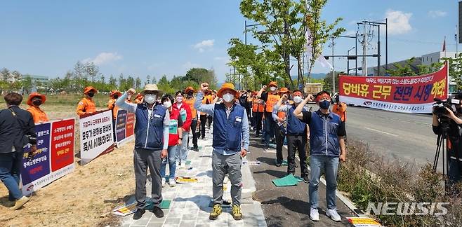[청주=뉴시스] 조성현 기자 = 전국공무원노동조합 충북소방지부는 17일 오후 충북 청주시 충북소방본부 청사 앞에서 3조 1교대 근무를 촉구하는 결의대회를 열고 있다. 2022.05.17. photo@newsis.com