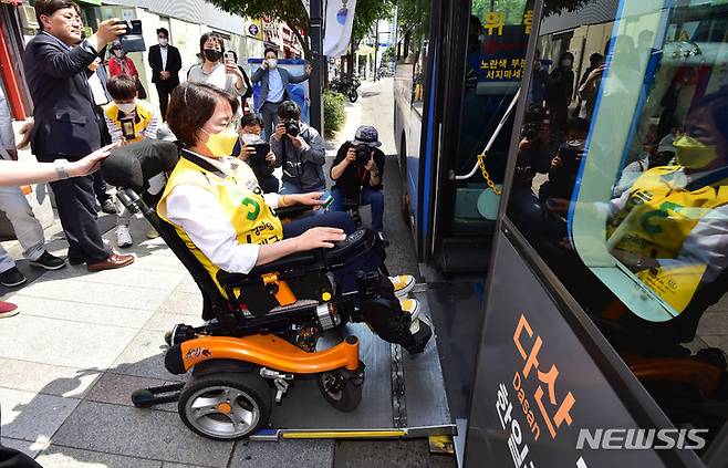 [대구=뉴시스] 이무열 기자 = 19일 오후 대구 중앙파출소 앞에서 열린 '6·1 지방선거 출마자 장애인 이동권 체험 행사'에 참여한 지방선거 출마자들이 전동 휠체어를 타고 버스에 탑승하고 있다. 행사에는 홍준표 국민의힘 대구시장후보의 배우자인 이순삼씨, 서재헌 더불어민주당 대구시장 후보, 한민정 정의당 대구시장 후보, 이인선 국민의힘 대구 수성구을 국회의원 보궐선거 후보가 참석했다. 2022.05.17. lmy@newsis.com
