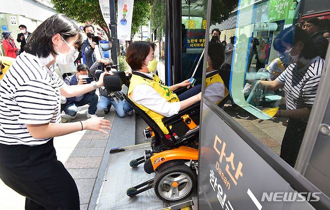 [대구=뉴시스] 이무열 기자 = 19일 오후 대구 중앙파출소 앞에서 열린 '6·1 지방선거 출마자 장애인 이동권 체험 행사'에 참여한 지방선거 출마자들이 전동 휠체어를 타고 버스에 탑승하고 있다. 행사에는 홍준표 국민의힘 대구시장후보의 배우자인 이순삼씨, 서재헌 더불어민주당 대구시장 후보, 한민정 정의당 대구시장 후보, 이인선 국민의힘 대구 수성구을 국회의원 보궐선거 후보가 참석했다. 2022.05.17. lmy@newsis.com