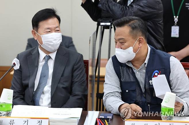 (세종=연합뉴스) 김주형 기자 = 17일 오후 세종시 정부세종청사 최저임금위원회 회의실에서 열린 제2차 전원회의에서 사용자위원인 류기정 한국경영자총협회 전무(왼쪽)와 근로자위원인 이동호 한국노총 사무총장이 대화하고 있다. 2022.5.17