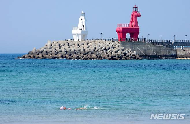 [제주=뉴시스] 우장호 기자 = 한낮 최고기온이 26.5도까지 오르는 등 초여름 날씨는 보인 17일 오후 제주시 이호해수욕장에서 한 시민이 수영을 즐기며 더위를 식히고 있다. 2022.05.16. woo1223@newsis.com
