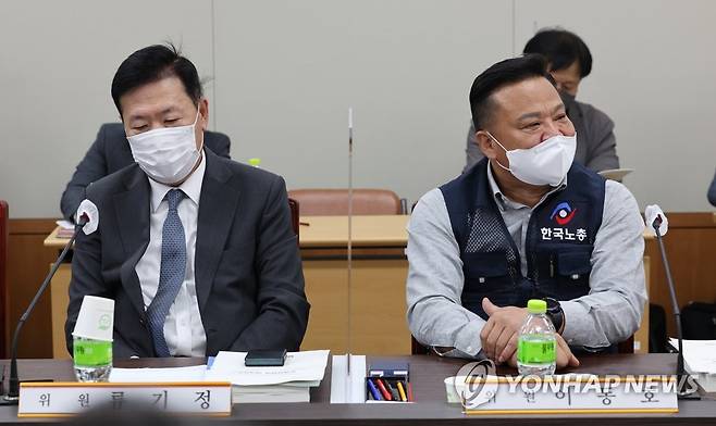 (세종=연합뉴스) 김주형 기자 = 17일 오후 세종시 정부세종청사 최저임금위원회 회의실에서 열린 제2차 전원회의에서 사용자위원인 류기정 한국경영자총협회 전무(왼쪽)와 근로자위원인 이동호 한국노총 사무총장이 자리하고 있다. 2022.5.17