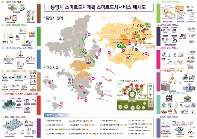 통영시는 9개의 분야에 총 17개 스마트도시서비스를 구축할 예정이며, 스마트관광서비스, 스마트 주차서비스, 섬마을 드론 택배서비스, 드론활용 재난 안전 모니터링 서비스, 스마트 시장실 서비스 등 5개의 서비스를 통영시 대표서비스로 선정했다.